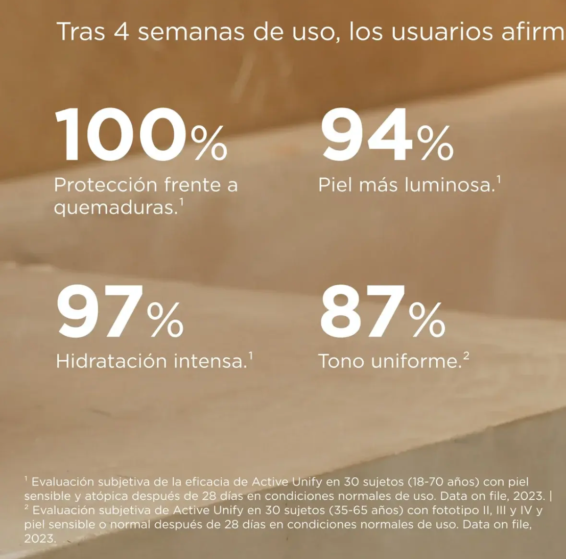 Ayuda a corregir las manchas ocasionadas por la radiación UVB/UVA y la luz solar azul con el fotoprotector de uso diario Active Unify SPF 50+. Proporciona triple acción despigmentante y una muy alta protección, unificando el tono de la piel y reduciendo la intensidad de las manchas en un 22%