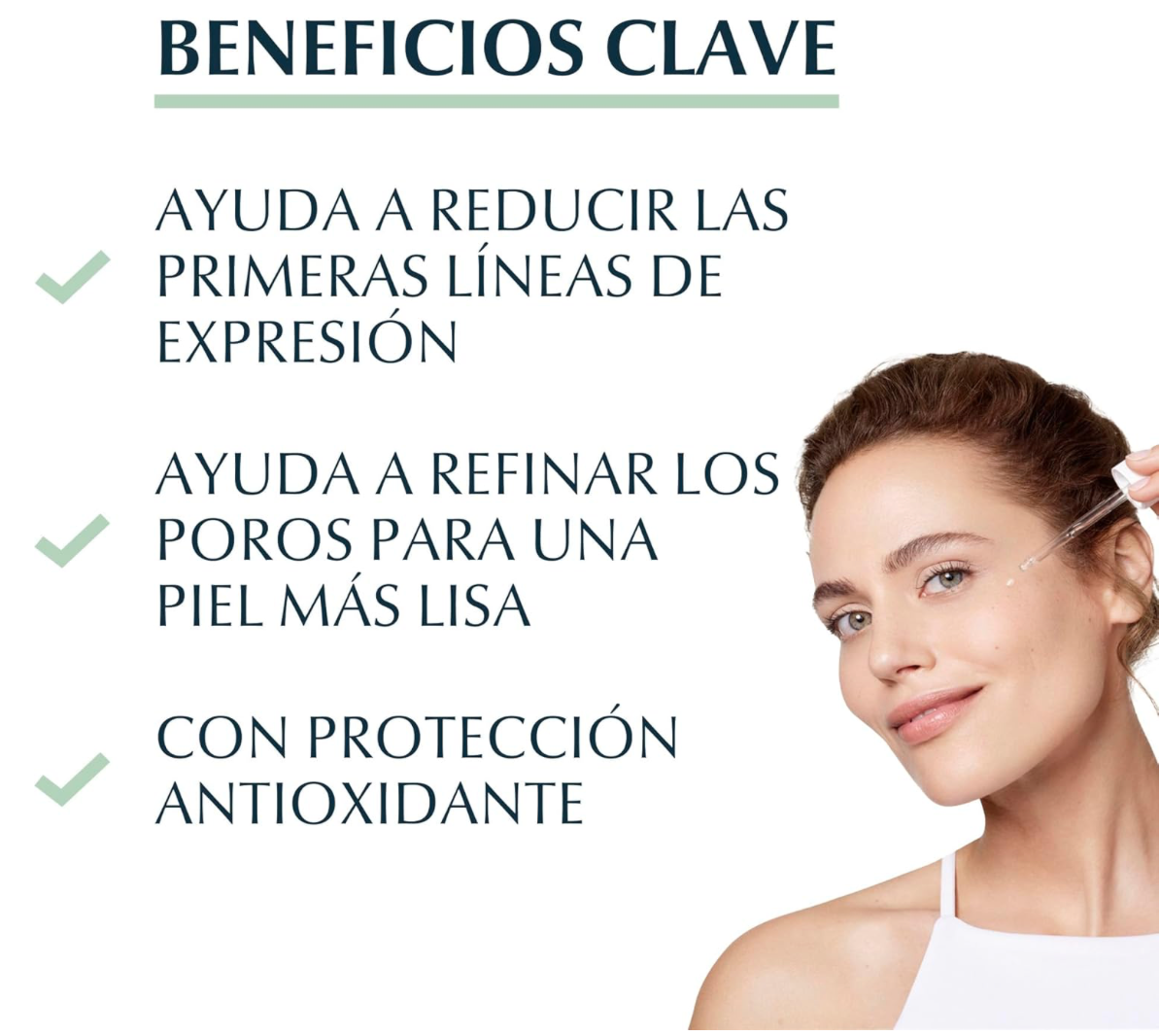 Serum facial ultraligero que afina los poros y ayuda a reducir las primeras líneas de expresión, con protección antioxidante. Adecuado para todo tipo de pieles, incluidas las propensas al acné. Textura no grasa, se absorbe rápidamente.